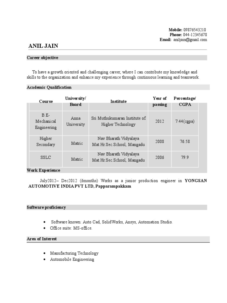 My goal is to grow professionally and for example, if you are a mechanical engineering student, highlighting that you've gone through production planning. Expert in implementation of each step of project. File contain mechanical fresher sample resume format in pdf and doc format. 0 ratings0% found this document useful (0 votes). About author of the website:
